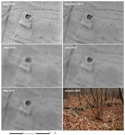 We have demonstrated that the leaf-on conditions have a significant impact on the readability of archaeological features. The potential to record and recognize such remains is—besides their character (linear or discrete features)—mainly related to the distribution of ground points, which in turn is dependent on the vertical and horizontal structure of the forest. As a result, datasets acquired during the peak of vegetation vigour are characterised by a limited number of ground hits even though the total point densities were significant. The impact of vegetation therefore cannot be easily compensated through increasing the total point density. It is rather the use of a lower pulse repetition frequency with associated higher energy per pulse that seems to have a positive effect in dense vegetation. This clearly confirms the results of other methodological ALS studies; at the same time, it meets the typical expectations and archaeological assumptions.