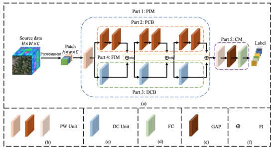 (a) The overall flowchart of HyperLiteNet. The five main parts: parallel interconnection module (PIM), pointwise convolution branch (PCB), dynamic convolution branch (DCB), feature interconnection module (FIM), and classification module (CM); (b) pointwise convolution (PW) units with different numbers of convolution kernels; (c) dynamic convolution (DC) unit; (d) fully connected layer (FC); (e) global average pooling (GAP); (f) feature interconnect (FI) structure.