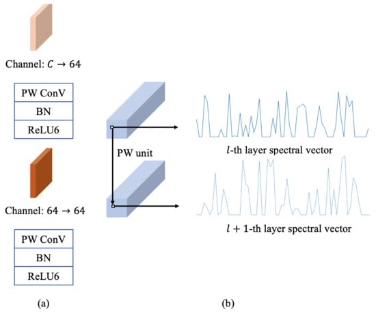 (a) PW units with the pointwise convolution, BN, and ReLU6. Convert the number of x channels from input channels to 64 (upside); convert the number of input features channels from 64 to 64 (underside). (b) Spectral vectors at a certain point in the l-th layer and the -th layer.