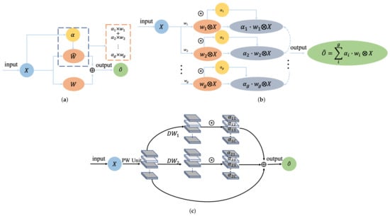 In traditional convolution, all input samples are treated equally to the convolution kernel, and the parameters of the convolution kernel are determined after the training process in a static network manner. Differing from static networks, dynamic networks attempt to adjust the network structure adaptively and dynamically according to the varied inputs. Therefore, for different inputs, a dynamic network can deform the network structure corresponding to the local areas, which efficiently improves the robustness and knowledge capacity of the network with low latency. The introduction of a dynamic network enables a more elastic mapping. Define the network convolutions in Figure 3a as follows: