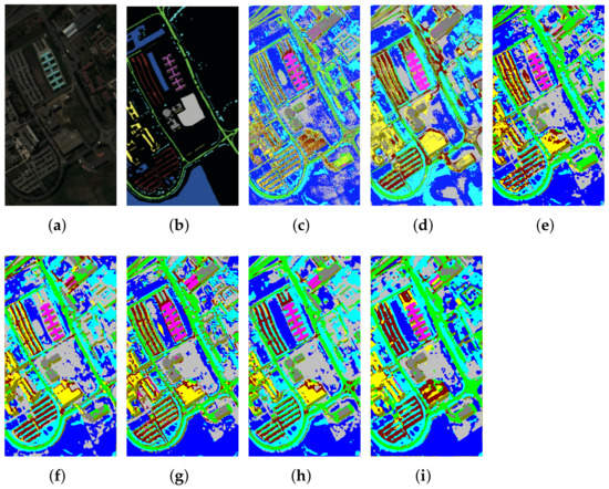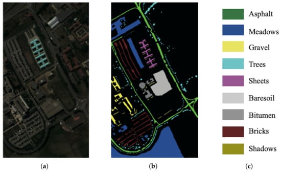 The University of Pavia (UP) dataset was collected in 2001 over the Pavia university campus through the Reflective Optics System Imaging Spectrometer (ROSIS). The UP dataset has 115 bands with a wavelength range from 0.43 to 0.86 m, and with pixels. Note that 12 bands of noisy or water-absorption regions are removed in our experiments. The UP dataset contains nine different ground-truth classes. The three-band false-color composite of the IN images and the corresponding ground-truth data are shown in Figure 5.