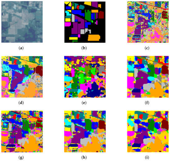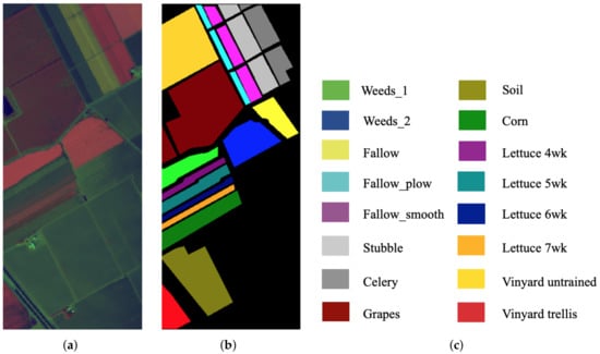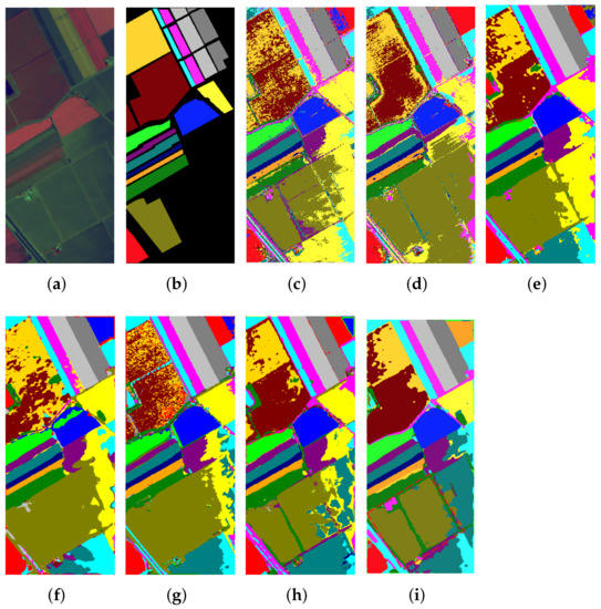 The Salinas (SA) dataset was gathered over the Salinas Valley in California by the AVIRIS sensor. The SA dataset has 220 bands with a wavelength range from 0.36 to 0.5 m, and with pixels. Note that 20 bands of noisy or water-absorption regions are removed in our experiments. The SA dataset contains 16 different ground-truth classes. The three-band false-color composite of IN images and the corresponding ground-truth data are shown in Figure 6.