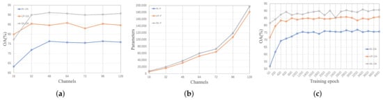 Effect analysis for the number of convolution kernels, the number of parameters, and the training epoch. (a) OA corresponding to different channel numbers (4000 epochs). (b) Parameters corresponding to different channel numbers. (c) OA corresponding to different training epochs (64 channels).