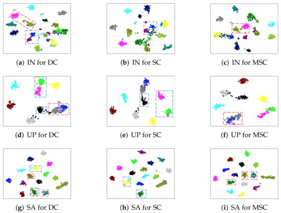 2D t-SNE feature visualization for different convolution types on three datasets. The corresponding colored dotted lines are used in the figure to indicate representative differences. (a) IN for DC; (b) IN for SC; (c) IN for MSC; (d) UP for DC; (e) UP for SC; (f) UP for MSC; (g) SA for DC; (h) SA for SC; (i) SA for MSC.
