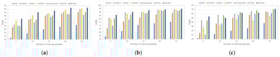 Overall Accuracy (OA) % with different training samples with 5, 10, 15, 20, and 25 for (a) Indian Pines (IN), (b) Pavia University (UP), and (c) Salinas (SA).