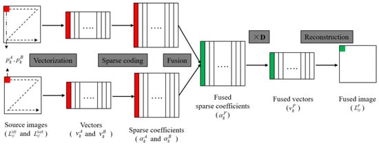 - Vector reconstruction. The fused sparse vector is obtained via the fused sparse coefficient multiplied by the same dictionary used in Step (3). The local mean subtracted in Step (2) is added back, and the final fused vector is obtained.