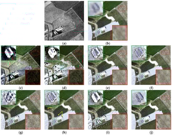 Figure 4 shows the fusion results of different methods in area 1, which features agricultural lands. The integration of MS and SAR images can effectively enhance the transitions and boundaries between buildings, roads, and cultivated lands and retain the colors at the same time. Figure 4a,b shows the HR SAR image and up-sampled LR multispectral image, which are the input images for various fusion methods. The HR multispectral image is provided for spectral evaluation (but not the ground truth), as shown in Figure 4j. Compared with Figure 4b, Figure 4c–h demonstrates that all the fusion methods improve the sharpness of MS image and effectively enhance the spatial and texture features. As can be seen from Figure 4c,d, the spatial enhancement of IHS and BTH fusion is obvious, but the colors also appear unnatural. The spectral distortions of agricultural land in the upper right corner and the building in the lower left are serious. At the same time, serious noises can be seen in the red circle marked in the upper right corner in Figure 4c,d. Compared with the original HR multispectral image, the fusion results of AWLPR and IW fusion (see Figure 4f,g) perform well in spectral preservation but integrate limited spatial and texture features. Besides, obvious artifacts can be seen near the boundaries of ground features. Figure 4h (GFTD fusion method) exhibits appealing visual performance, while it suffers from aberrant colors in the areas marked with yellow arrows. Figure 4e,i shows that the LP-based and proposed methods strike the balance between spectral preservation and spatial enhancement. The colors of these two methods are comparable to the HR multispectral image, and the buildings and boundaries are markedly enhanced. Moreover, the noises and artifacts are effectively avoided. Compared with the LP-based method, the fusion result of the LPSR method looks sharper in the region marked with a green rectangle, and overall, the image is clearer, with stronger contrast.