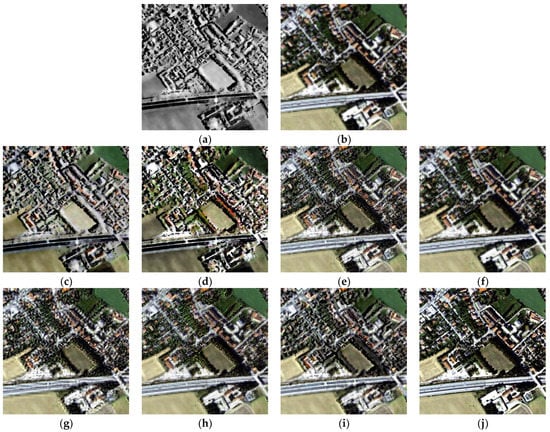 Fusion results of different methods in area 2. (a) HR SAR image; (b) up-sampled LR multispectral image; (c) IHS fusion; (d) BTH fusion; (e) LP-based fusion; (f) AWLPR fusion; (g) IW fusion; (h) GFTD fusion; (i) proposed LPSR fusion; (j) original HR multispectral image.