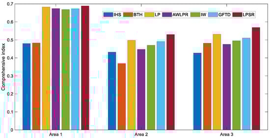 The evaluation metrics for CI are correlation coefficient on the full spatial resolution (CCfull), structural similarity (SSIM), and feature mutual information (FMI). We selected them because they measure the spectral preservation, spatial enhancement, and information incorporation abilities. Moreover, the value ranges of them are similar. The weights are equal for them because we considered the abilities of spectral preservation, spatial enhancement and information incorporation equally in this paper. Figure 7 illustrates the CI values of all the methods in three areas, from which we can get a more intuitive impression on the quantitative performance. The proposed LPSR fusion method obtains the highest CI values in all the three areas, which indicates that our method achieves the best performances from a comprehensive angle considering spectral, spatial, and information characteristics. In addition, the order of CI values highly accords with visual inspection results, which validates the effectiveness of the proposed index.