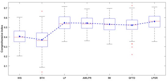 The box plot and mean values of the comprehensive index on a large set of images.