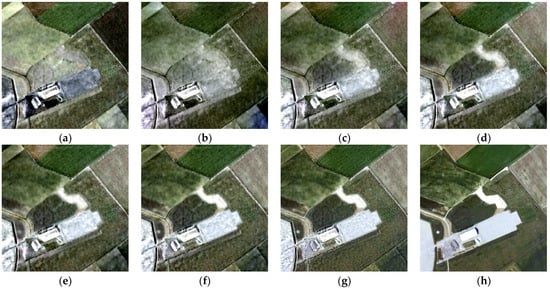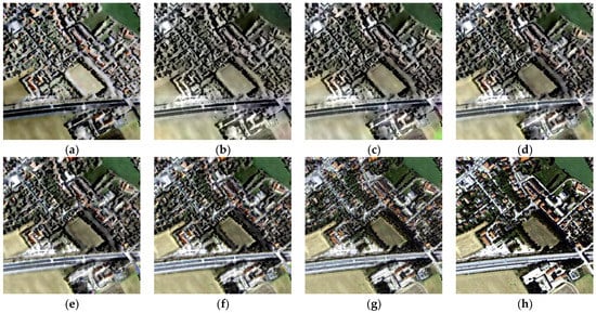 Fusion results of adjustability experiment in area 3. (a) IHS fusion; (b) LPSR-5; (c) LPSR-4; (d) LPSR-3; (e) LPSR-2; (f) LPSR-1; (g) LP-based fusion; (h) original HR multispectral image.