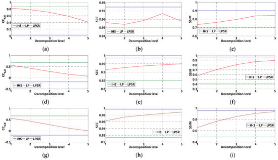 As can be seen from Figure 9, Figure 10 and Figure 11, the fused image incorporates more characteristics from SAR image. Therefore, the spatial and texture enhancement is more significant when the decomposition level arises from 1 to 5. Nevertheless, the color changes more considerably when the decomposition level increases. When the decomposition level is 1 or 2, the fused image is visually similar to the LP-based fusion image in spectral consistency, while the spatial improvement is close to the IHS fusion method when the decomposition level reaches 4 or 5. Therefore, different trade-offs can be achieved between spectral fidelity and spatial improvement by adjusting the decomposition level of the Laplacian pyramid. From the statistical results in Figure 12, we can draw a similar conclusion. When the decomposition level equals to 1, the proposed LPSR fusion method achieves a good performance in spectral index CC, which is close to the LP-based method. While the decomposition level increases from 1 to 5, the spatial evaluation indexes (SCC and SSIM) of the proposed LPSR method approach the IHS fusion method, which indicates that the fusion result can be converted from the mode emphasizing spectral preservation to focusing on spatial and texture details injection. The verified adjustability makes the proposed fusion method more applicable and can satisfy different application requirements.