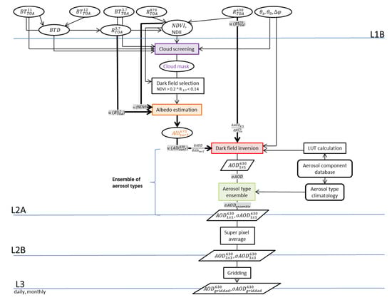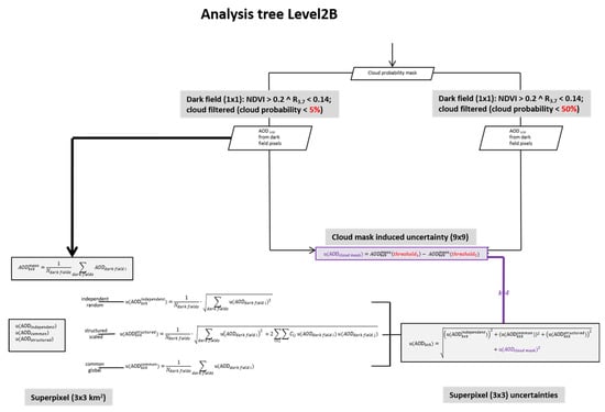The AOD for each super-pixel and grid cell is determined as described in Figure 3 and Figure 4. Aggregated AOD is calculated as the mean of AOD values of all (dark field) pixels. In the averaging, no weighting with dark-field uncertainties is conducted since these uncertainties depend strongly on AOD values themselves and could therefore introduce a bias to a subfraction of retrieved AOD values (either high or low, depending on the geometry, surface brightness, and albedo). In addition, at this processing level, the uncertainty induced by uncertainties in the cloud masking is estimated from the AOD difference obtained with two different thresholds of cloud probability. Due to the simplicity of these equations, a measurement-function-centred diagram is not provided for this step. The sources of uncertainty are given in Table 8.