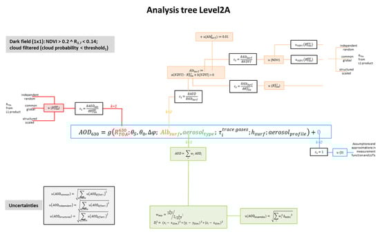 To derive AOD uncertainties, the following FIDUCEO uncertainty tree for the single pixel AOD inversion (L2A) was prepared (Figure 2), which determines how each of the uncertainty components can be calculated. In this diagram, the calculation of the uncertainty of each of the three dominant terms of the right side of the measurement function in the center is depicted. The (red) uncertainty of the reflectance inversion is derived as product of the reflectance uncertainty and the AOD sensitivity to the measured reflectance . Additionally, the (brown) uncertainty of the surface albedo is calculated as a product of the albedo uncertainty and the AOD sensitivity to the albedo . However, in this case, the albedo uncertainty needs to be calculated by propagating the uncertainties of NDVI (and ultimately R630 and R870) and R3.7 through the linear conversion function used. Furthermore, a constant global uncertainty value of 0.01 is added which reflects the uncertainty of using the linear regression. The aerosol type uncertainty (green) cannot be calculated with a similar product, but this is replaced by the spread of an ensemble of 36 different aerosol mixtures.