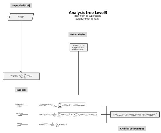 The propagation of uncertainties from L2A to L2B (and similar to L3) is then determined by the FIDUCEO analysis tree (L2B, Figure 3). Here, the correlation structures are now taken into account. The independent contributions (no correlation at all) can be squared (Equation (5a)); thus, this noise term is reduced by 1/ with an increasing number of pixels N. In contradiction, the common contributions are simply averaged (Equation (5b)) and achieve no reduction with growing number N. In between those two extremes, the structured contributions (Equation (5c)) depend on the correlation cij (which typically decrease with growing distance of elements I and j). In the end, the total super-pixel uncertainty is then summed up from these three parts with Equation (4) (squared, as they are independent from each other):