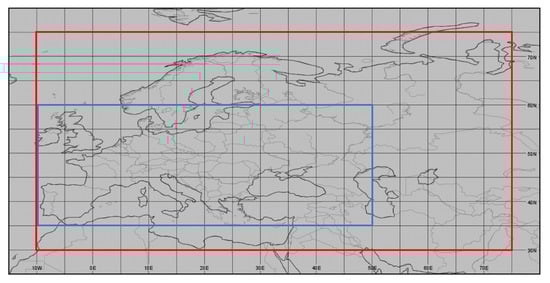 Regions covered by the dataset in this paper: “Europe and North Africa”, targeted by this study (in red, Section 3.1). “Europe” for comparison with [] (in blue, Section 3.2).