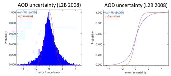 As a first assessment of how far the uncertainties match the true errors, the ratio of error (AVHRR AOD–AERONET AOD) over uncertainties is calculated (named “normalized error”) after [] and probability distributions of the normalized error are plotted as shown in Figure 6. We plot the probability distributions and the cumulative distributions in comparison to a Gaussian distribution with the same standard deviation (0.145). This analysis shows a reasonable agreement of the real AVHRR uncertainty distributions with the theoretical Gaussian distributions (except for larger normalized errors in the long tails) and proves a reasonable statistical agreement of uncertainties and errors.