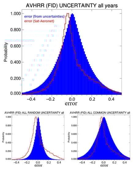Probability distributions of the estimated true error vs. AERONET (in red) and errors derived from uncertainties (in blue) for the 10 year AVHRR AOD dataset. Top: distribution for propagated uncertainties; bottom: hypothetic distributions for “all random” (left) and “all common” (right) propagated uncertainties.