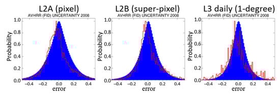 Finally, in Figure 9, we assess the distributions of propagated uncertainties for 2008 for different product levels: L2A (single pixels, standard deviation of 0.16), L2B (super-pixels from 3 × 3 single pixels, standard deviation of 0.145), and L3 daily (1-degree, standard deviation of 0.12) versus their true error distributions (in all cases using the same matching criteria and thus neglecting the effects of sampling/representativity). All three plots show a good agreement of the true error and uncertainty-derived distributions (with a small negative bias for the true error histograms), which indicates that the propagation to higher product levels provides meaningful uncertainties.