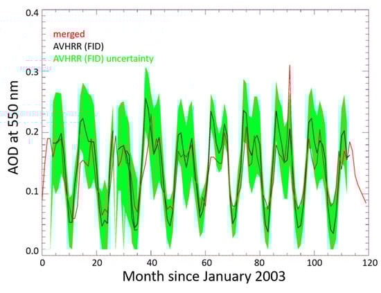 We show the monthly mean time series aggregated for the whole of Europe (over land only, 10W–50E, 35–60 N, excluding parts of Algeria and Morocco in this rectangle) and its propagated AOD uncertainty in Figure 10. We compare with a multi-sensor merged dataset exactly for the same area including the period 2003–2012 []. Figure 10 shows the good agreement (with lower minima for AVHRR, possibly due to different coverage), and also good agreement in the seasonal cycle; even a double peak in summer is visible, while the intra-annual maxima/minima variation disagrees (likely due to the different sampling). We can also see that the overlap of the AVHRR record parts from the two platforms NOAA-16 (black) and NOAA-18 (red) in 2005 (7 months) in Figure 10 is very good. Finally, the agreement between the merged and the AVHRR AOD records lies largely within the AVHRR propagated AOD uncertainty range.
