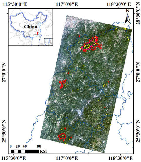 Location of the three protected areas: The Meihuashan National Nature Reserve (MHS), Minjiangyuan National Nature Reserve (MJY), and Wuyishan National Park (WYS) (red shapes), sample areas (red points), and samples (yellow points) in two scenes of Landsat 8 Operational Land Imager (OLI) images (Path/Row of 120/41 and 120/42, red–green–blue (RGB) composite).