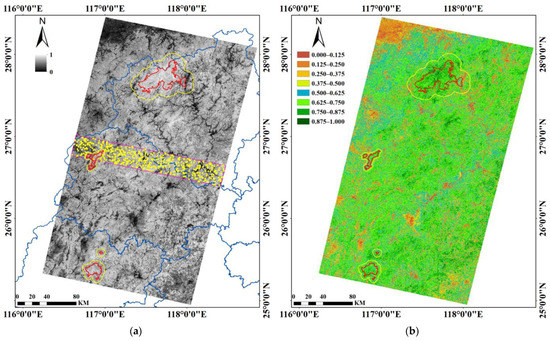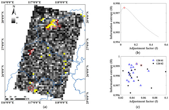 The resampled slope image with a 6-km spatial resolution showed that the majority of blocks were located in WYS and four blocks were close to MHS; however, MJY remained away from the blocks (yellow pixels of blocks and red shapes of protected areas in Figure 3a). After calculation of the information entropy of the SEVI in the blocks, the optimized adjustment factor for every block was obtained from the peak of the maximum entropy (shown in Figure 3b). Then, the best adjustment factor for each scene of the Landsat 8 OLI image was achieved from the block that obtained the highest information entropy of the SEVI (Figure 3c). Finally, we determined that the best adjustment factors were 0.048 for the Landsat 8 OLI image of 120/41 and 0.056 for the Landsat 8 OLI image of 120/42 using our developed BIE-algorithm, and we used them to calculate the SEVI results.