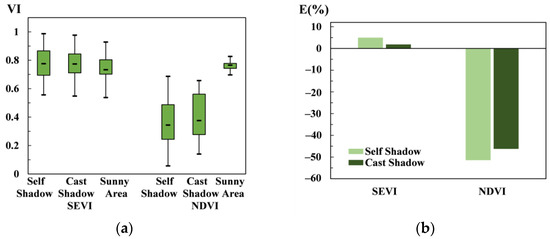 where is the relative error, is the vegetation indices’ mean of shadow samples, such as the cast shadow and self-shadow, and is the vegetation indices’ mean of sunny area samples.