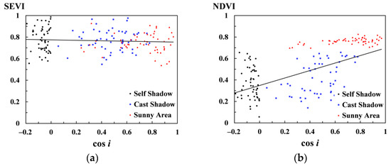 Scatter plots of vegetation indices vs. the cosine of the solar incidence angle (cos i): (a) SEVI; (b) NDVI.