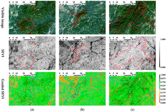 The visible image, and the SEVI and graded SEVI of protected areas: (a) MHS; (b) MJY; (c) WYS (red shape for national park, pink shape for national nature reserve).