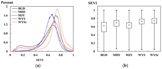 The histograms of the SEVI percentage showed that MJY and MHS had nearly normal distributions with one peak (blue and green lines in Figure 9a); however, WYS and BGD had two peaks (red and black lines in Figure 9a), i.e., a bimodal distribution. The SEVI means of the three protected areas and BGD showed a sequence of WYS (0.718) > MHS (0.672) > MJY (0.624) > BGD (0.572) (Table 2), which were in accordance with the green level sequence in Figure 8. Specifically, the SEVI histogram of the WYSr, as the precursor of the WYS, was also normally distributed with one peak (red dotted line in Figure 9a) and the SEVI mean reached 0.736. In addition, the box plot showed the same sequence of the SEVI medium, and the interval ranged from quarter 1 to quarter 3 (Figure 9b). These SEVI distribution characteristics indicated that the protected areas achieved a higher abundance and activity of green vegetation than the regional background, and three protected areas showed a sequence of WYS > MHS > MJY. In contrast, the histograms of the NDVI percentages of the three protected areas and BGD showed only one peak, and the means of NDVI showed an abnormal sequence of MHS (0.695) > WYS (0.686) > MJY (0.671) > BGD (0.658) (Figure 9c). Meanwhile, the histogram and box plot of NDVI were compressed, which decreased the discriminations among the three protected areas (Figure 9c,d).