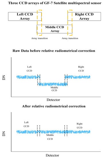 The GF-7 satellite BWD multispectral imager is a typical push-broom sensor, which consists of three single CCD arrays located in an across-track dimension. The linear detector array of the GF-7 BWD constructs an image one row at a time as the satellite moves [4,5]. Each CCD array of the BWD has 3072 detectors. There are two overlap regions between three CCD arrays, and each overlap region contains 108 detectors. Figure 3 shows the three CCD arrays of the GF-7 satellite multispectral sensor and the corresponding overlap region when imaging. Variations between the detectors of the GF-7 BWD always appear in the along-track scanning direction. Noise was apparent in the GF-7 satellite raw data before the relative radiometric correction. The radiometric nonuniformity always caused banding and striping, or dark lines, in the along-track scanning direction on the imagery [6,7,8]. The on-orbit detector-to-detector radiometric variation of the GF-7 multispectral imagery was corrected using relative radiometric calibration coefficients.