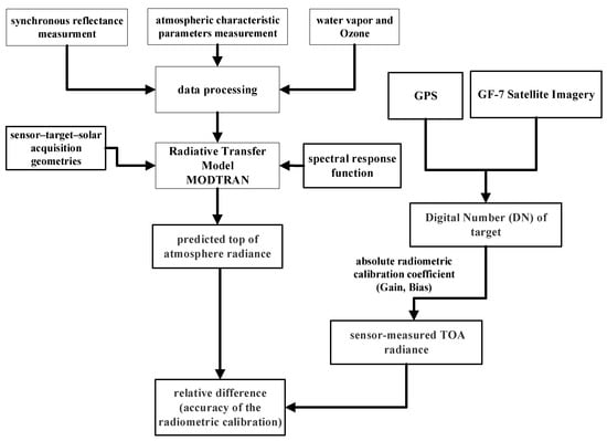 Two independent absolute radiometric assessment campaigns of the GF-7 satellite at different calibration sites were performed by LASAC, using a reflectance-based approach. Reflectance-based radiometric calibration was commonly recognized as one of the most reliable approaches [9,10,11,12]. The surface spectral reflectance and atmospheric parameters of the calibration sites were synchronously measured during the GF-7 satellite overpass time. A radiative transfer model, such as MODTRAN, is commonly used for radiometric calibration and validation [13,14]. The predicted TOA radiance of the target was computed by MODTRAN using these synchronous measurements, and the sensor-measured TOA radiance was radiometrically calibrated from DN with absolute radiometric calibration coefficients. The relative difference between the predicted TOA radiance and sensor-measured TOA radiance was recognized as the accuracy of the radiometric calibration [15,16,17,18,19]. Figure 6 shows a detailed flow chart of the reflectance-based absolute radiometric evaluation approach.