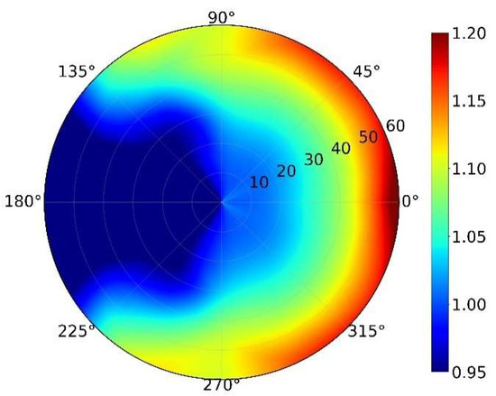where is the BRDF for the reflected radiance in the azimuth () and zenith () directions at wavelength (), which comes from the incident radiance in the azimuth () and zenith () directions. is measured in the nadir direction (). Figure 10 shows the ANIF values of the gray target from the BRDF measurement.