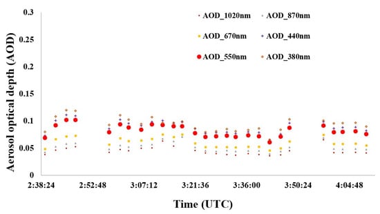 The atmospheric parameters at the Baotou site were measured by a Cimel CE318 sun photometer. The aerosol optical depth (AOD), aerosol microphysical information, and column amounts of water vapor can be collected automatically every day at this site. Figure 11 shows the synchronous measurement of aerosol optical depth at the Baotou site during the overpass of the GF-7 satellite on 23 July 2020. These atmospheric parameter measurements serve as inputs in MODTRAN, to predict the TOA radiance.
