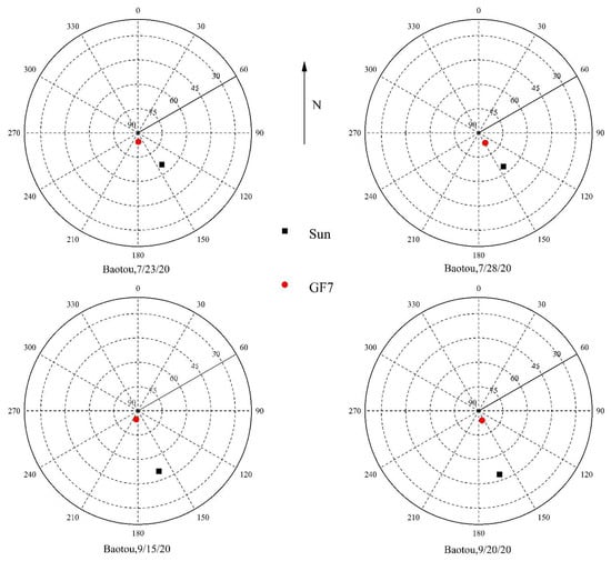 Solar–target–satellite acquisition geometric conditions of the GF7 satellite at the Baotou site.