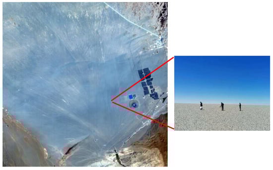 The Dunhuang site was China’s national radiometric calibration site, which has been used to calibrate China’s satellites (such as the Feng-Yun series, Zi-Yuan series, and Gao-Fen series of satellites) since the 1990s. The Dunhuang site was selected as one of the “instrumented sites” (LandNet) by CEOS WGCV [30,31]. The Gobi Desert at the Dunhuang calibration site is large, spatially uniform, and homogeneous. The spectral reflectance of the Gobi Desert is stable, with an annual variation of less than 2%. Figure 13 shows the Gobi Desert at the Dunhuang site.
