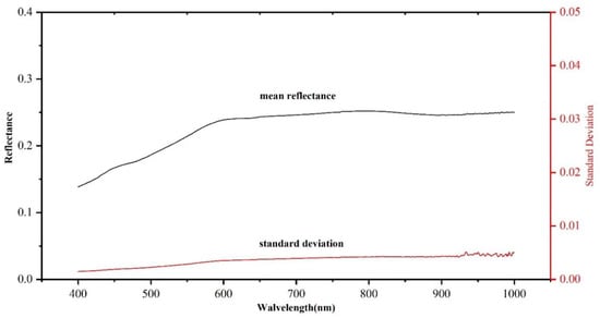 The methodology took 30 × 30 pixels as one sample, and more than 150 samples were collected in the central region of the Gobi Desert and more than 600 spectra were collected at the Dunhuang calibration site. Figure 14 shows the average and standard deviations of the surface reflectance measurement of the Gobi Desert in the range of 400–1000 nm. Since the Gobi Desert is stable and homogeneous, the standard deviation of more than 600 spectra is less than 1%, as shown in Figure 14. The atmospheric parameters at the Dunhuang site were measured by a Cimel CE318 sun photometer. The daily AOD at 550 nm varied from 0.11 to 0.18 during the campaigns at the Dunhuang test site, and the synchronous AOD measurements at the GF-7 satellite overpass time were less than 0.15.