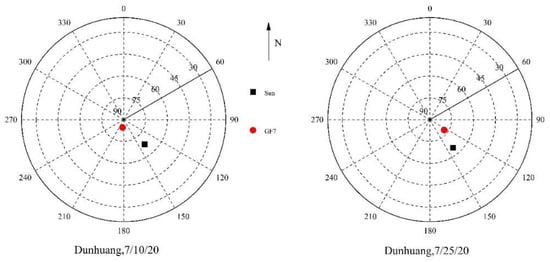 Solar–target–satellite acquisition geometric conditions of the GF7 satellite at the Dunhuang site.