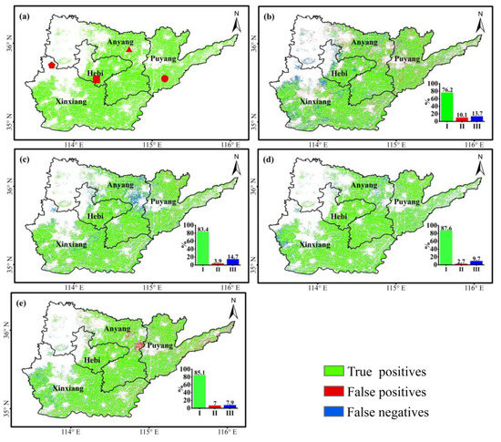 Taking the map of the spatial distribution of winter wheat at the jointing-heading stage as the reference image (Figure 3a), it was subtracted from the winter wheat classification map corresponding to other periods to generate difference maps (Figure 3b–e) to display the differences in the areas identified as winter wheat during the different growth periods. In the difference maps, green represents TP (true positive; that is, identified as winter wheat in both periods), red represents FP (false positive; that is, identified as not being winter wheat during the jointing-heading period but identified as winter wheat during the other periods) and blue represents FN (false negative; that is, identified as winter wheat during the jointing-heading period but not as winter wheat during the other periods). From the green, red and blue areas in the difference map, it can be seen that there is little difference between the four other periods and the jointing-heading period; however, the sizes of the commission and omission errors vary. Further details are given in the bar charts, in which I represents the ratio of the number of correctly predicted winter wheat pixels to the union of the predicted number and the true number of winter wheat pixels (TP + FP + FN), II represents the ratio of the number of wrongly predicted winter wheat pixels to the union of the number of predicted winter wheat pixels and the true number, and III represents the ratio of the number of ‘missing’ winter wheat pixels to the union of the number of predicted winter wheat pixels and the true number. This means that, the higher I is, the smaller the difference between the amount of winter wheat predicted by the model in these two periods; the higher II is, the more serious the incorrect detection of winter wheat in these two periods; and the higher III is, the greater the amount of winter wheat that the model has failed to detect. As can be seen from Figure 3, compared with the jointing-heading period, the greatest difference in the number of pixels identified as winter wheat is for the seeding-tillering period: in this case, I is only 76.2%, and II and III are 10.1% and 13.7% respectively, this indicates serious commission and omission errors, the reviving period has the smallest difference: I is then 87.6% and the value of II is only 2.7%. It can also be seen from the difference maps that the areas with the greatest differences are concentrated near the boundary between Anyang City and Puyang City as well as in the west of Xinxiang City and the east of Puyang City. Satellite imagery shows that these areas are mostly mountainous areas with complicated terrain and fragmented winter wheat planting areas.