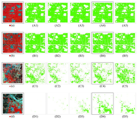 Results for the identification of winter wheat in four representative areas of the study area using random forest classification: (a,b) represent, respectively, winter wheat areas with dense planting, flat terrain; (c,d) represent, respectively, winter wheat areas with fragmented land use and complex terrain (Sentinel-2 false color composite images, bands 8/2/3). Parts (1) to (5) in each row show the pixels identified as winter wheat using the random forest classification during the seeding-tillering, overwintering, reviving and jointing-heading period, respectively.