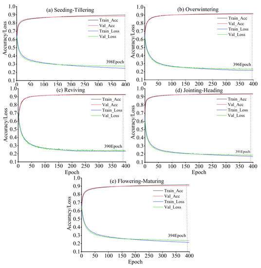 Using the same U-net network model framework, the training and validation data sets for each growth period were trained separately. The loss function and accuracy of the training and validation sets of each growth period obtained during the training process are shown in Figure 5. It can be seen from the figure that all five U-Net models reach stability after 400 training epochs. Near the beginning of the training, the loss function curve of training and validation set decreased obviously, and the accuracy of training and validation set also increased rapidly. By the time of training for 50 times, the decreasing speed of the loss function curves of both the training and validations quickly begin to flatten out until the accuracy no longer increases. During the process of the model training, the accuracy of the validation sets was set as the monitoring object. After the models had reached stability—that is, when the accuracy of the validation sets had reached a maximum—the models were saved under the optimal weights. This corresponded to epochs 398, 396, 390, 391 and 394 for parts (a), (b), (c), (d) and (e) in Figure 5, respectively.