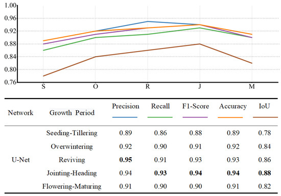 In order to verify the accuracy of the U-Net model’s semantic segmentation, the precision, recall, F1-score, IoU and accuracy were used to quantitatively evaluate the results for the semantic segmentation of winter wheat using the five test sets corresponding to different growth stages [54]: