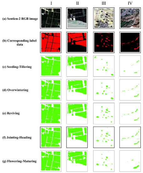 Results of the semantic segmentation of winter wheat using the test set. I-IV, respectively, represent winter wheat planting areas in an area of flat terrain, an area with multiple land-cover types, an area of fragmented terrain and an area of complex terrain. (a) True color Sentinel-2 composite images; (b) corresponding sample labels. (c–g), respectively, show the results of the semantic segmentation of the sample data for the seeding-tillering, overwintering, rejuvenation, jointing-heading and flowering-maturing periods.