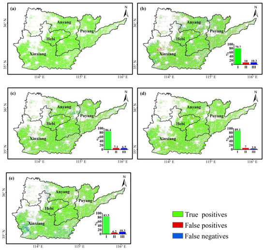 The model parameters under the optimal weight for each growth period were called, and the Sentinel-2 data sets of the study area that were to be classified were trained. The training results were then spliced together for each growth period to generate the winter wheat classification map. Then, taking the winter wheat classification map for the jointing-heading period (Figure 8a) as the reference image, it was subtracted from the winter wheat classification map at the other periods to generate difference maps (Figure 8b–e). Further details are given in the bar charts, in which I represents the ratio of the number of correctly predicted winter wheat pixels to the union of the predicted number and the true number of winter wheat pixels (TP + FP + FN), II represents the ratio of the number of wrongly predicted winter wheat pixels to the union of the number of predicted winter wheat pixels and the true number, and III represents the ratio of the number of ‘missing’ winter wheat pixels to the union of the number of predicted winter wheat pixels and the true number. From Figure 8, it can be seen that, except for the seeding-tillering period, for which the value of I is only 79.7%, I is above 83%. The highest value (89.1%) corresponds to the reviving period, indicating that the difference between the area identified as winter wheat in this period and in the jointing-heading period is the smallest. In addition, it can be seen that, for the overwintering period, the value of II is higher than that of III, which indicates that the commission error is more serious than the omission error and that the area identified as winter wheat is larger than during the jointing-heading period.