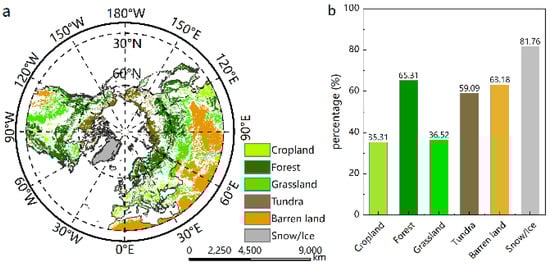 The GLASS-GLC dataset was preprocessed by reclassification and raster calculation, and the 34 year land cover type invariant areas were extracted as the study area (Figure 1a). Shrublands in this study were not included because of their small number of invariant areas. The land cover types in the study area have changed substantially in the past 34 years. Only 35.31% of the cropland, 65.31% of the forest, 36.52% of the grassland, 59.09% of the tundra, 63.18% of the barren land and 81.76% of the snow/ice have not changed compared with 1982 (Figure 1b).