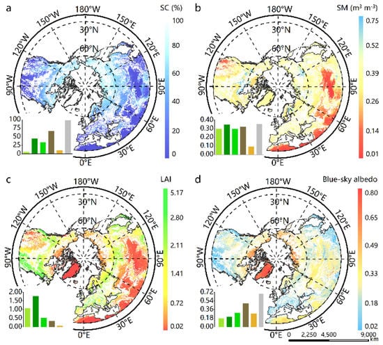 Spatial distribution of 34 year average SC (a), SM (b), LAI (c) and blue-sky albedo (d). Insets at the bottom left show the 34 year average of different land cover types in (a–d), with bar colors corresponding to the colors in the legend in the Figure 1a.