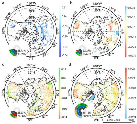 Figure 3 displays the spatial pattern of annual mean trends in SC, SM, LAI and blue-sky albedo in the middle-high latitudes of the NH (p < 0.05). Over the past 34 years, the annual mean SC of 23.73% of the total pixels had a significant change. Among those, 99.59% showed a significant decreasing trend, mainly concentrated in forest (35.26%), tundra (30.68%) and grassland (24.02%), and the highest decrease rate was distributed in forest (Figure 3a). The annual mean SM of 22.27% of the total pixels had a significant trend, and 85.66% showed a significant decreasing trend, mainly concentrated in grassland (32.50%), barren land (26.98%) and forest (25.07%). The highest decrease rate was distributed in forest and barren land. A total of 14.34% showed a significant increasing trend, mainly concentrated in barren land and forest (Figure 3b). For improving the estimation of SM in arid and semiarid areas, the self-calibrating palmer drought severity index (scPDSI) was selected as a supplement to verify the variation in SM (Figure S1). The results showed that the scPDSI in barren land was mainly decreasing, which was consistent with the SM results [,]. The annual mean LAI of 25.23% of the total pixels had a significant trend, and 74.38% showed a significant increasing trend, mainly concentrated in forest (38.39%), barren land (23.66%) and grassland (15.11%). The highest increase rate was distributed in forest and cropland. A total of 25.62% showed a significant decreasing trend, mainly concentrated in barren land, forest and grassland (Figure 3c). The annual mean blue-sky albedo of 65.12% of the total pixels had a significant trend, and 98.97% of the annual mean blue-sky albedo showed a significant decreasing trend, mainly concentrated in forest (22.80%), snow/ice (17.73%), cropland (17.73%) and barren land (17.43%). The highest decrease rate was mainly distributed in snow/ice (Figure 3d).