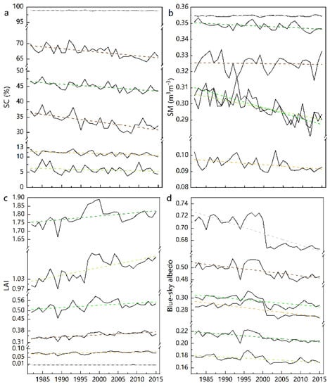 Figure 4 summarizes the interannual temporal variation trends of the average SC, SM, LAI and blue-sky albedo for the entire study area without consideration of land cover types and for different land cover types. Table 1 shows the fitting equation, goodness of fit and significance test (F test) of annual mean trends.
