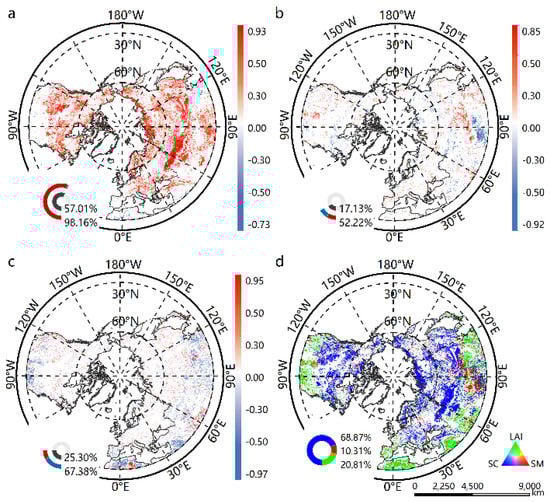 Spatial distributions of the partial correlation coefficients between blue-sky albedo and SC (a), SM (b) and LAI (c), the spatial distribution of RGB synthesis with three partial correlation coefficients (d). Nonsignificant pixels were excluded. Insets at the bottom left in (a–c) show the percentages of pixels with significant correlation (dark gray), significant positive correlation (red) and significant negative correlation (blue), respectively. Insets at the bottom left in (d) show the percentages of pixels dominated by each factor, with bar color corresponding to the color in the map.