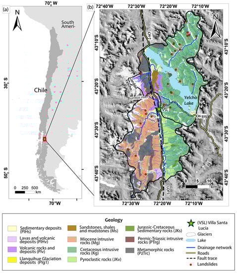 The Yelcho Lake basin, which is located in a NW direction covering more than 116 km2. The mountain ranges that make up these valleys constitute the second morphological feature, formed by intrusive rocks from the Norpatagonic Batholith, metamorphic rocks from the Principal Mountain Range metamorphic complex and volcanic rocks from the Pleistocene grouped in the Cordón–Yelcho volcanic complex [19,20,21] (Figure 1).